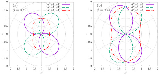 Note that the above Equations (5)–(13) are valid for beams crossing at an arbitrary angle. For the sake of simplicity, below we analyze only the situation when two photon beams propagate in perpendicular directions and have the same intensity, so that (). We do not consider the general case of elliptically polarized photon beams since it leads to rather cumbersome expressions, especially when major axes of polarization ellipses are tilted with respect to the propagation plane of the photons (i.e., to the z-axis in Figure 1).
