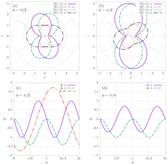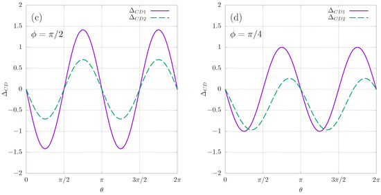 In Figure 2, we show the magnitudes of the geometric DP and CD parameters and for two values of the relative phase, and . As can be seen in Figure 2a,b, the shape of the DP polar diagrams for remains essentially the same for different values of the relative phase , while their tilt angle with respect to the z-axis varies noticeably. Another observation is that the CD1 parameter has the same angular dependence for and with only its amplitude changing; see Figure 2c,d. It is also seen in Figure 2c that for , CD1 and CD2 parameters have the same angular dependence. This is the consequence of expressions (19) and (18) for CD parameters. Indeed, for we have ; therefore, the second term on the right-hand side of (19) vanishes, and both and become proportional to .