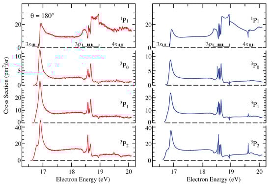 Subsequently, more decisive tests of the theory were provided by angle-differential excitation cross sections for Ne, Ar, Kr, and Xe in absolute units, measured with the Fribourg spectrometer. We show just one example, namely the excitation of the four lowest excited states in Ne from threshold to 20 eV, measured at the backward scattering angle 180 with an energy width of 10 meV for the incident electron beam. In Figure 7 we compare the respective experimental cross sections (left side) with those of the B-spline R-matrix calculations (right panels) [18]. Amazing agreement is observed in both the absolute size and in the detailed resonance structure, which shows characteristic changes for the four final excited Ne levels. We should note that we did not communicate the experimental data to Oleg and Klaus before we received their results.