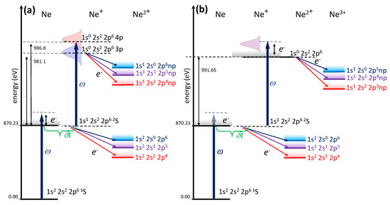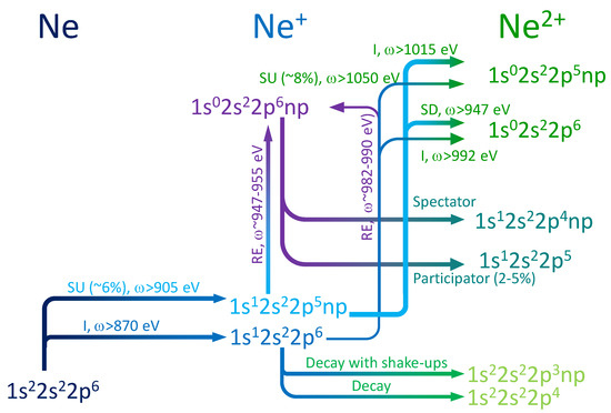 Strictly speaking, there are other mechanisms due to which the same final states (see the scheme in Figure 1 and discussions below) could be produced in neon and its ions. These mechanisms are connected to ionization of the neutral atom, or of the ion SCH state 1 s 1 , accompanied by a shake-up process to the n p -state. In order to evaluate how important such mechanisms are, we calculated the probabilities for shake-up processes in atomic (see Table 4) and ionic (see Table 5) ionization. Our approach for such calculations is based on the SP -model, i.e., the initial atomic (or ionic SCH) state is a pure state while the final single ionic (or double ionic) states are mixed with each other. The difference compared to SP -model described above is in the omission of states with 3 s / 3 d -electrons and in only considering n p -electron states with n 5 . [We label this approach as the SP ( 0 ) -model.] From Table 4 and Table 5 it is clearly seen that (i) the probability of the considered mechanisms is strongly suppressed in the calculation within the SP ( 0 ) -model and the dominating mechanism is direct ionization of the inner shell; and (ii) the more efficient shake-up goes to the 2 S (for the atom) and 1 S (for the ion) term of the residual ion. The latter means that the core remains unaffected by electron correlation.
