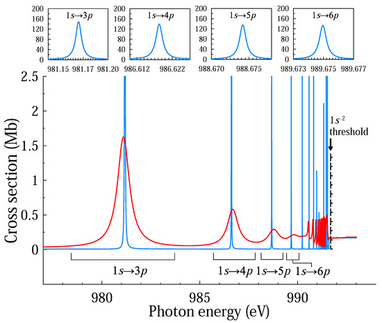 We performed photoionization calculations in the framework of the nonrelativistic L S -coupling approximation by means of the B-spline R-matrix (BSR) approach [29]. Each individual electron wave-function in the initial and final states was obtained in the multiconfiguration Hartree-Fock approximation [30]. The photoabsorption cross section of Ne + 1 s 1 2 s 2 2 p 6 for photon energies covering the region of autoionizing series 1 s 2 n p ( n = 3 , 4 , , ) in two models ( P and SP , see below for details) is shown in Figure 2. In both models, the initial state of Ne + 1 s 1 2 s 2 2 p 6 is a pure 2 S state, while the sets of final doubly-charged Ne 2 + states differ in the following ways: