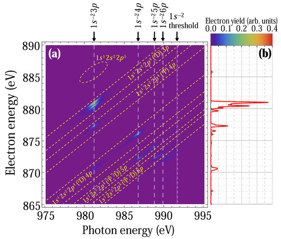 We now simulate photoelectron spectra (PES) under the assumption of an “ideal” setup, where the photon bandwidth and electron detector resolution are about 100 meV each to perfectly resolve all the DCH resonances. In order to simplify the analysis, we represent all the PES for the photon energy ranging from 975 eV to 995 eV (in steps of 0.1 eV) by the false color 2D-map in the photoelectron energy region 865 eV to 890 eV in Figure 3. In that figure, one can clearly identify groups of lines corresponding to particular 1 s 2 n p -resonances. The diagonal features on the 2D-map correspond to particular prevailing final states. When the photon energy is tuned to the n = 3 resonance (981.1 eV), the 1 s 2 3 p 1 s 1 2 p 2 3 p (spectator) and the 1 s 2 3 p 1 s 1 2 p 2 4 p (shake-up) channels are dominant. At the same time there is a weak (but nonzero) contribution at the electron energy of 886 eV from the 1 s 2 3 p 1 s 1 2 p 1 process, in which the 3 p electron is a participator. Tuning the photon energy to the higher n = 4 resonance (986.8 eV), we see the same tendency, i.e., the 1 s 2 4 p 1 s 1 2 p 2 4 p (spectator) and 1 s 2 4 p 1 s 1 2 p 2 5 p (shake-up) channels dominate with prevailing spectator decay, and there are also small lines from the 1 s 2 4 p 1 s 1 2 p 2 3 p (shake-down) decay channel in the vicinity of electron energy ∼886–887 eV. Going further to n 5 the trend described above persists with only slightly increasing influence of the shake-down processes.