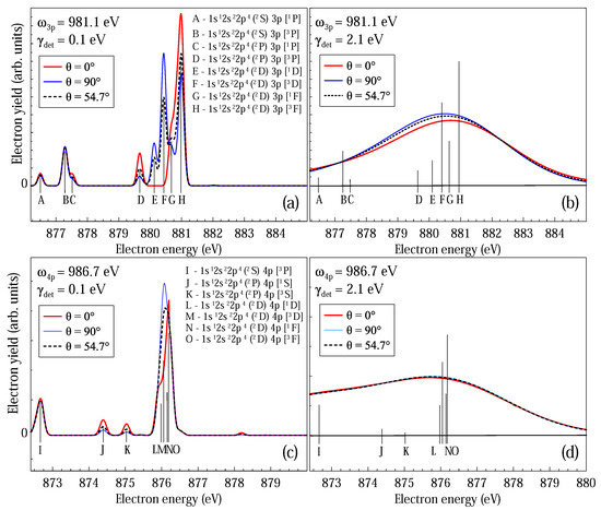 However, convolving the spectrum with a currently more realistic experimental resolution (like resolution in the experiment [16]) diminishes the angular anisotropy, because the strongest lines have different angular dependencies. For ionization with 4 p (and higher) spectators, an angular dependence does not appear even for the “ideal” detector.