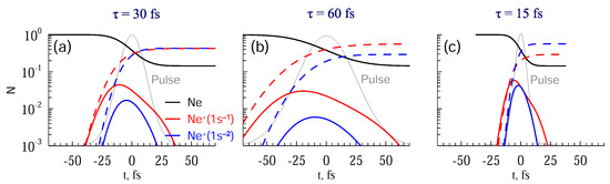To analyse the system evolution we applied the method of solving the rate equations as described in [31]. Figure 5 displays the populations of the different states calculated at a high photon fluence F = 1000 ph / A ˚ 2 and varying pulse durations of τ = 15 fs, 30 fs and 60 fs, respectively; the photon energy is in resonance with the 1 s 3 p transition in Ne + . Because the overall number of photons is the same, increasing the pulse duration means decreasing the flux. For this reason, the population of the ground state tends towards the same value (black lines in panels (a,b,c) of Figure 5). For the singly-charged ion with inner-shell vacancy 1 s 1 2 s 2 2 p 6 (red lines), there is competition between Auger decay to different Ne 2 + states (red dashed lines) and excitation to Ne + 1 s 0 2 s 2 2 p 6 3 p (blue lines). Because of the short lifetimes of both Ne + resonances ( 1 s 1 and 1 s 2 3 p ), no population in these states should remain at the end of the pulse. Figure 5a shows the case with a duration such that the probabilities for the intermediate ion to decay or to be excited are equal; for longer pulses (Figure 5b) the intermediate ion has enough time to decay and the products of the decay of SCH 1 s 1 2 s 2 2 p 6 are significant; for shorter pulse (Figure 5c) the excitation mechanism is more effective and the products of the decay of DCH 1 s 0 2 s 2 2 p 6 3 p resonance dominate.