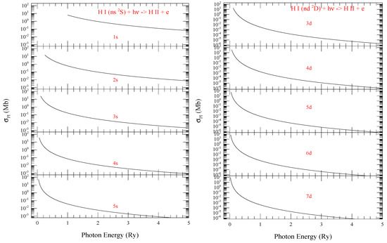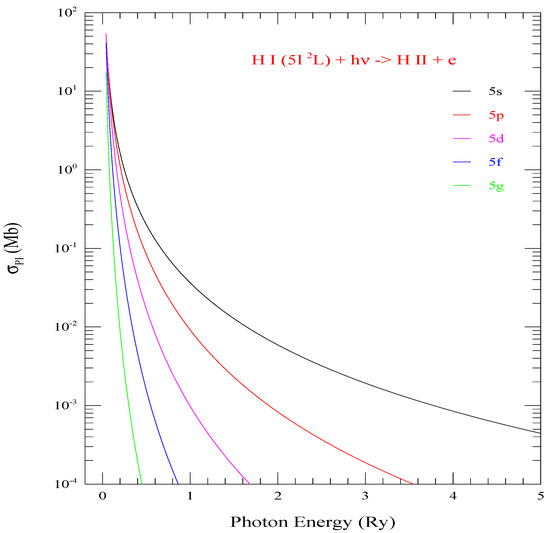 Various codes use central field approximation to compute background feature of for complex atomic systems (e.g., [19,20]). They use distorted wave approximation to describe the continuum electron. Such programs can provide for hydrogen to a good approximation. However, use of Gaunt factors are needed for precise values. Using Gaunt factor and recurrence relations of Burgess [12], Seaton computed the first set of high accuracy photoionization cross sections of levels, where n = 1–10 and , of hydrogen under the Opacity Project (OP) (The Opacity Project Team [21]). OP carried out the first systematic detailed study of photoionization of the ground and many excited states of the astrophysically important multi-electron atomic systems, from hydrogen to iron. Seaton’s cross sections were not published, but are available at the OP database, TOPbase [22]. Atomic data for the same levels with n = 1–10 are also available with a finer energy mesh at the database NORAD-Atomic-Data [23,24].