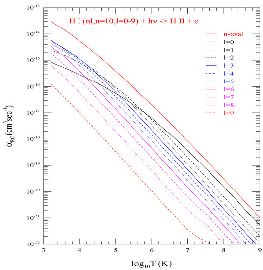Level specific electron-ion recombination rate coefficients () of the 10 individual l-levels (0–9) of shell n = 10, and the n-total (red curve with highest values) which is the summed total of all 10 individual levels. They demonstrate peak does not follow values of l-order at low temperature bu follows at higher temperature.