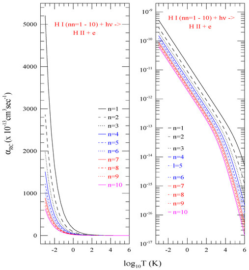 An example of with n = 10 and l = 0–9 are illustrated in Figure 3. All curves corresponding to l = 0–9 are drawn with different colors and/or with different type (e.g., solid, dashed, or dotted). The sum of all provides the “n-total” curve (red, solid) which is distinctly separated from all curves for individual l-values below it. The figure shows that at low temperature the height of curves do not follow the l-order as expected from l-dependence of at threshold but they follow the order at higher temperature region. of the lowest level does not have the highest peak at lower temperature, but dominates at higher temperature region. The high temperature dominance comes from the slower decrease in of at higher energies compared to the higher l-levels. Couple of small kinks, visible at logarithmic scale, can be noticed for two l-curves (8 and 9) at very high temperature. They arise from some numerical instability of very small values.