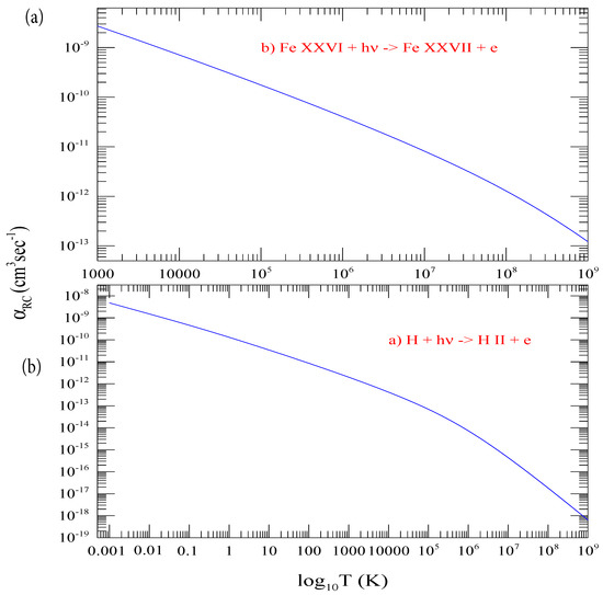 Figure 5a presents the curve for the total recombination rate coefficients of hydrogen, , which include contributions of individual shells from n = 1 to 800 and the top-up contributions from n = 801 to infinity. Table 1 presents the numerical values of . The range of temperature for is chosen wide, from 10 to 10 K. This allows computation of for hydrogenic ions over a temperature range of practical need. The temperature for an ion of nuclear charge z is equivalent to . Hence, obtaining of a hydrogenic ion of charge z, such as hydrogen-like neon with z = 10, at temperature 1000 K will need at 10 K. As in illustration of calculating of a hydrogenic ion, Figure 5b presents of Fe XXVI obtained from using z-scaling.