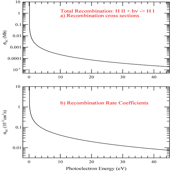 The total recombination cross sections, , and recombination rate coefficients of hydrogen with respect to the photoelectron energy E are presented in Figure 6. The energy unit is chosen to be in eV because of use of eV unit for the photoelectron in laboratory measurements. Both and include contributions of n = 1–∞. Except for the sharp rise in the very low photoelectron energy, the features show smooth decrease with energy.