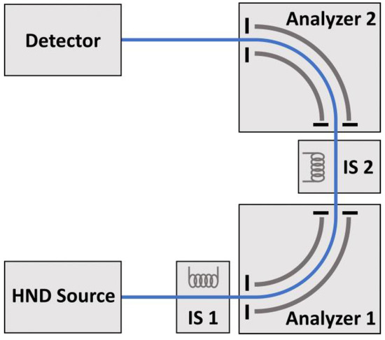 Neutral He droplets were formed via expansion of He gas (99.9999% purity, Messer Austria GmbH, Gumpoldskirchen, Austria) with a stagnation pressure of 2 MPa through a pinhole nozzle with a diameter of 5 μm (A0200P, Plano GmbH, Wezlar, Germany) attached to an oxygen-free copper block (MB-OF101 with a residual-resistance ratio, RRR > 200, Montanwerke Brixlegg, Brixlegg, Austria) that was mounted to the second stage of a closed-circuit cryocooler (RDK-408D2, Sumitomo Heavy Industries Ltd., Tokyo, Japan). Through a combination of the cooling by the cryocooler and resistive heating, we were able to control the temperature of the compressed He down to 4.2 K. In the present investigation, temperatures of 7 K and 9 K were selected, and 11.7 mm downstream from the nozzle, the droplets passed through a skimmer with an aperture of 0.8 mm on their way into the first ionization source. Here, the droplets were ionized by the impact of electrons with a kinetic energy of 40 eV and an electron current of 300 µA for promoting the formation of positively charged droplets and 30 eV and 430 µA for negatively charged droplets. The ionizer design was based on a Nier-type electron source using a tungsten coil filament. Charged droplets were then mass-per-charge selected by a spherical sector electrostatic 90° energy analyzer with a central radius of 7 cm and a distance between the plates of 2 cm. The resolving power of the two energy analyzers was limited by the apertures and was determined from the width and position of the precursor peaks to E/ΔE~63. The m/z-selected charged droplets could then be ionized further by a second electron ionization source of the same type as the first one. A second electrostatic analyzer identical to the first one was then employed to analyze the final mass-per-charge ratio of the droplets, which were detected with a Channeltron-type secondary electron multiplier (Dr. Sjuts, KBL 510). The energy resolution when measuring electron energy-dependent ion efficiency curves was estimated by analyzing the signal decrease for the cationic precursor peak signal around 22 eV. A Gaussian fit on the derivative of the slope gave an upper limit of ±0.65 eV for the spread in electron energy. A residual gas pressure of about 10−6 Pa was achieved with turbomolecular pumps (one HiPace 2300, two HiPace 700 and one TMU 521, Pfeiffer Vacuum Technology AG, Aßlar, Germany) backed by two oil-free roughing pumps (ACP 40, Pfeiffer Vacuum Technology AG, Aßlar, Germany). A schematic diagram of the apparatus is shown in Figure 1.
