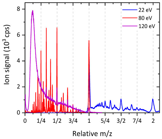 Positively charged He droplets were formed upon electron bombardment of neutral He droplets (expansion conditions of 7 K and 2 MPa, average neutral droplet size of 1.1 × 107 [38]) with an electron energy of 40 eV and an electron current of 300 µA. This results in a log-normal-shaped m/z distribution with an average value of about 7 million He atoms per charge [35]. The first energy filter (Analyzer 1 in Figure 1) selected a narrow slice of this distribution at a relative m/z of 2.7 × 106 He atoms per charge (corresponding to a relative m/z value of 1 in Figure 3). In the second ion source (IS 2 in Figure 1), the selected droplets were crossed with a 210-µA electron beam, and depending on the electron energy, differently charged product droplets were formed. At 22 eV (blue line in Figure 3), most product droplets had higher m/z values than the selected precursor, thus indicating a reduction of the charge state. Peaks at the exact fractional numbers demonstrated negligible mass loss due to evaporation of neutral He atoms, as was already observed previously [33]. At 120 eV, an increase in the charge state resulted in lower m/z values (purple line in Figure 3). The presence of differently charged precursor droplets and a relatively poor energy resolution of the energy analyzer resulted in a curve where only the most intense product channels could be seen as narrow peaks at fractional number m/z values, such as ¼, ⅓, ½, ⅔ and ¾. By setting the second ion source to 80 eV and 100 µA, the formation of very highly charged droplets was strongly reduced, which enabled a better assignment of individual reaction channels (red line).