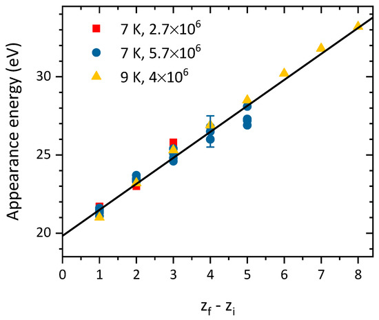 Via the vanishing current method, the threshold energies were determined with an uncertainty of ±1 eV for all reaction channels measured at two initial mass-per-charge values of −12 and −32 million (shown in the Supplementary Materials, Figure S4) He atoms per charge, and the values are summarized in Table S3 and plotted in Figure 12 as a function of the final charge state zf of the resulting cationic droplets. In contrast to the cations shown in Figure 5, the x-axis corresponds to the final charge state and not the difference zf − zi. Again, we assigned a slope of the fit of 1.34 eV to the decreasing probability of the ejection of an increasing number of low-energy electrons. The only difference with the initially positively charged droplets (shown in Figure 5) was the fact that the appearance energies did not seem to depend on the initial charge state. The repulsive Coulomb interaction between the electrons and the initially negatively charged He droplets supported the escape of low-energy electrons. However, we were only able to obtain data for zi = −1 and −2.