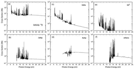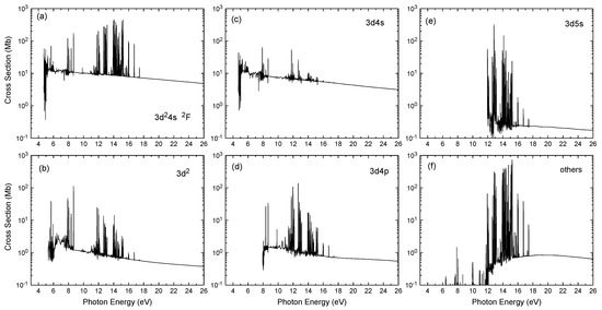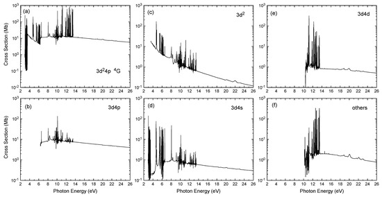 The total photoionization cross-sections from the ground state of scandium are shown in Figure 1a in the photon energy region from the Sc ionization threshold to 26 eV. It is clear from the figure that the resonance structures dominate total photoionization cross-sections, especially in the low energy region. A fine energy grid of eV has been employed from the Sc first ionization threshold at 6.56 eV to the highest ionization threshold around 19 eV to account for resonances. There are many narrow and strong resonance series converging to various residual Sc ionic thresholds. The nonlocal thermodynamic equilibrium modeling calculations require the partial photoionization cross-sections for leaving the residual ion in various states. The photoionization of Sc populates many residual final ionic states. Our calculations exhibit no dominant ionic channel in the photoionization of a given initial state. It is due to the complex Sc atomic structure. The partial photoionization cross-sections from the ground state, for leaving the residual Sc ion in the final states of the , , , and , are presented in Figure 1b–e, whereas Figure 1f presents thr contribution from all other states of Sc II. The summed partial cross-sections from various states of Sc belonging to a given configuration are presented in Figure 1, as there are a large number of final ionic states.