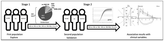 We developed a replicative study in two stages. In the first, we evaluated SNPs selected by fine-mapping regions associated positively with N-ERD using the GoldenGate array (Illumina, Inc., San Diego, CA, USA), and only the associated results (p < 0.05, OR < 1) were considered for validation prior to an internal group consensus. In the second stage with another population of subjects by allelic discrimination using qPCR and its association with clinical variables (Figure 1).
