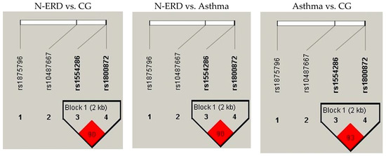 The haplotype CC conferred a statistical association in the comparison N-ERD vs. CG p = 0.01, OR = 0.65, (CI95% 0.47–0.92), and N-ERD vs. asthma, p = 0.04 OR = 0.69, (CI95% 0.49–0.97); we detected a similar magnitude with TA alleles in the aforementioned comparisons (Table S1). The two SNPs in IL10 are in Hardy–Weinberg equilibrium, rs1554286, p = 0.78 and rs1800872, p = 0.80. We did not identify linkage disequilibrium with the SNPs of PPARG and TBXAS1 (Figure S1).