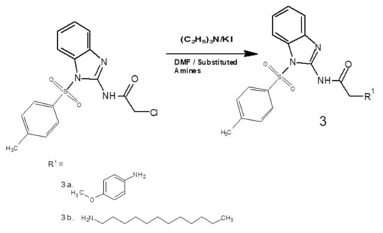 2-amino benzimidazole derivatives 3a and 3b were synthesized following a three-step reaction. Initially, 2-aminobenzimidazole was protected using para toluene sulfonyl chloride (p-TsCl) in the presence of an acetonitrile/water mixture according to a reported method with little modification []. In the second step, acetamide was prepared using chloroacetyl chloride (C2H2Cl2O) in anhydrous dichloromethane, CH2Cl2 (30 mL), at 0 °C. Initially, the reaction mixture was stirred continuously for 15 min on the same temperature, and then it was stirred for further 1 h at ambient temperature/room temperature. Needle-like crystals of crude 2-chloro-N-[1-(4-methylbenzene-1-sulfonyl)-1H-benzimidazol-2-yl] acetamide were obtained, which were further purified through recrystallization in ethanol. The melting point was recorded as 99–102 °C; yield 82% []. In the third step, the equimolar ratios of the intermediate product, triethylamine ((CH3)3N), potassium iodide (KI), and substituted amines (a and b), respectively, were stirred in dimethylformamide (DMF) (30 mL) at room temperature for 5 h (Figure 1: general scheme). The completion of the reaction was assessed by using TLC. The mixture was extracted with ethyl acetate. Anhydrous magnesium sulfate was used to dry the separated organic layer, which was then filtered, and the solvent was removed using a rotary evaporator to obtain the crude final compounds. The purity of the respective final compounds was ensured through silica gel column chromatography [].