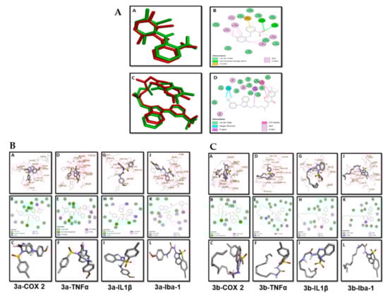 (A) Pose analysis and 2D depictions for meclofenamic acid (A,B) and 6,7-dimethyl-3-[(methyl{2-[methyl({1-[3-(trifluoromethyl)phenyl]-1h-indol-3-yl} methyl)amino]ethyl} amino)methyl]-4h-chromen-4-one (C,D) in the protein structures of cyclooxygenase-2 (COX-2) and tumor necrotic factor (TNFα), respectively (green = co-crystallized ligand, red = re-docked ligand). (B) Post docking analysis visualized by Discovery Studio Visualizer in both 2D and 3D poses. Interactions between 3a and COX2 (A,B), TNF-α (D,E), interleukin (IL)-1β (G,H), and ionized calcium-binding adapter molecule (Iba-1) (J,K). 3D poses (A,D,G,J) and 2D (B,E,H,K). (C,F,I,L) represents the best pose of 3a that fitted to COX2, TNF-α, IL-1β, and Iba-1, respectively. (C) Post docking analysis visualized by Discovery Studio Visualizer in both 2D and 3D styles. Interactions between 3b and COX2 (A,B), TNF-α (D,E), IL-1β (G,H), Iba-1 (J,K). 3D style (A,D,G,J) and 2D style (B,E,H,K). (C,F,I,L) represents the best pose of 3b that fitted to COX2, TNF-α, IL-1β, and Iba-1, respectively.