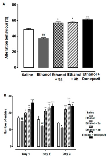 Both compounds 3a and 3b showed a positive increase in percent spontaneous alternation behavior of rats through an injected dose of 10 mg/kg. In the final trial, the resultant behavior (%) was noted in saline (1 ml/kg), ethanol (2 g/kg), ethanol + 3a (10 mg/kg), ethanol + 3b (10 mg/kg), and ethanol + donepezil (3 mg/kg) treated groups as 47.0 ± 0.6%, 37 ± 0.65%, 57.40 ± 1.0%, 59 ± 2.1%, and 61.0 ± 1.2%, respectively (Figure 3A). All group results were potentially significant (p < 0.05 vs. ethanol group).