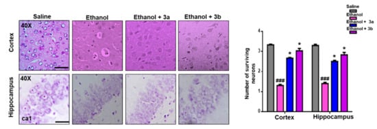 Neuroprotective potential of benzimidazole acetamide derivatives 3a and 3b was further demonstrated by H&E staining. The ethanol group showed vigorous morphological changes in the cortex and hippocampus of the rat brain, relative to the saline group (Figure 4, p < 0.01). As shown, ethanol produced abnormal morphological features, such as scalloped neuronal shape associated with cytoplasmic eosinophilia/pyknosis and basophilic nature of nuclei. Treatment with compounds 3a and 3b mitigated the ethanol-induced neurotoxicity, and thus more intact cells were noticed in the treated groups (p < 0.05, Figure 4).