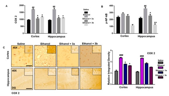(A,B) The protein expression of COX2 and p-NF-κB were quantified by ELISA. The data are expressed as the mean ± SEM. * and ** show p < 0.05 and p < 0.01, respectively, relative to ethanol, while ## p < 0.01 relative to saline (n = 6/group). (C) Immunohistochemistry results of COX2 in the cortex and Dg region of the hippocampus. Bar 20 μm, magnification 40× (n = 6/group). COX2 exhibited cytoplasmic localization in both tissues. Histograms show a comparatively higher expression of COX2 in the ethanol group. * shows p < 0.05 and indicates significant difference relative to ethanol, while ### p < 0.001 shows significant difference relative to saline group. Data are presented as mean ± SEM. Data are analyzed by one-way ANOVA followed by post hoc Bonferroni multiple comparison test using GraphPad Prism 6 software.