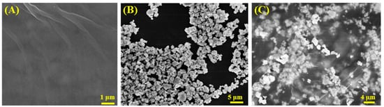 Electron microscopy images of the (A) pure graphene oxide (GO), (B) pure Ta2O5 nanoparticles, and (C) Ta2O5-GO composite nanoparticles.
