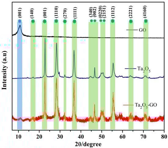 Patterns of pure Ta2O5, Ta2O5-GO composites, and graphene oxide (GO) nanosheets.