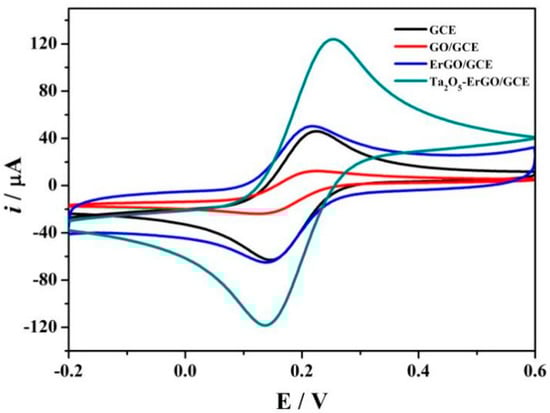 The cyclic voltammograms of bare GCE, GO/GCE, ErGO/GCE, and Ta2O5-ErGO/GCE were obtained in K3[Fe(CN)6] containing 0.1 M KCl, as indicated in Figure 3. As ipa/ipc ≈ 1, the redox peaks appearing in each electrode tested were a pair of quasi-reversible ones. At the bare GCE, the potential separation (∆Ep) of the redox peaks was 0.079 V with the weak current of 60.52 (ipa) μA and 63.87 (ipc) μA, while with the presence of the poor conductive material GO, the redox peak currents of GO/GCE decreased precipitously with ipa = 23.96 μA and ipc = 24.18 μA. Moreover, after electrochemical reduction of GO to ErGO, the current on ErGO/GCE was higher than that of GO/GCE, implying a better conductivity of ErGO than that of GO. The intensity of the anodic and cathodic peak current of ErGO was 51.13 and 55.71 µA, respectively. Above all, the largest redox peak current (ipa = 135.7 μA, ipc = 134.5 μA) occurred to Ta2O5-ErGO/GCE, which approximately increased by twofold. The result shows that Ta2O5-ErGO/GCE dramatically improved electrochemical performances owing to the large specific surface area. For further investigation, the effective electroactive areas of various electrodes could be figured out by the Randles–Sevcik equation [,]: