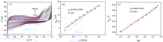 (A) Cyclic voltammograms of oxytetracycline on Ta2O5-ErGO/GCE at different scanning rates; (B) relationship between oxidation peak current (ipa) and scanning rate (v); (C) the oxidation potentials (Ep) are linearly proportional to the Napierian logarithm of scan rate (lnv) (the current values have been baseline-corrected).
