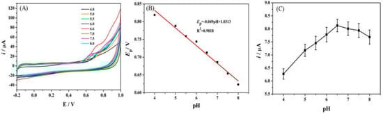 For the investigation of the effect of solution pH, the CVs of 10 µΜ oxytetracycline were recorded in different pH of PBS, as shown in Figure 6A. With the enhancement of pH, the oxidation peaks directly shift toward negative potential, and the peak potentials (Ep) decrease linearly with pH, as depicted in Figure 5B. The linear equation of peak potential and pH is Ep = −0.049pH + 1.0313 (R2 = 0.9818), illustrating that protons (H+) participated in the electrochemical reaction of oxytetracycline. As Figure 6C depicts, with the increase in pH, the ipa increases constantly until the pH is 6.5. Subsequently, the pH keeps aggrandizing, while the oxidation current of oxytetracycline decreases. Thus, pH = 6.5 is the optimal pH for detecting the oxytetracycline in this study.