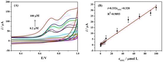The calibration curve for oxytetracycline at Ta2O5-ErGO/GCE was characterized by cyclic voltammetry under the optimal experimental conditions. The typical voltammograms are depicted in Figure 8A. In the range of 0.2–100 µM, the oxidation peak current is reasonably linear to oxytetracycline concentration (Figure 8B). The linear regression equation can be described as ipa (µA) = 0.332cOTC (µM) + 0.328 (R2 = 0.9893). According to the equations, LOD = 3S/N (S: Blank solution standard deviation; N: The slope of calibration plots), and the detection limit was identified as 0.095 μM. It mainly ascribes the excellent sensing performance to the synergistic effect of Ta2O5 and ErGO mentioned above.