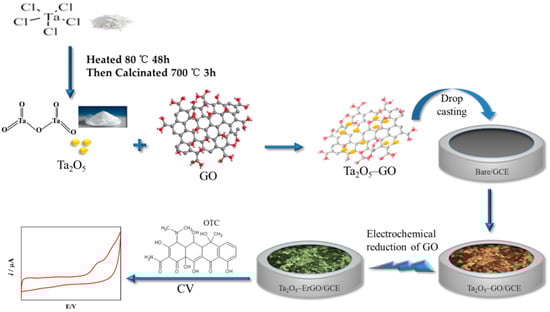 In this study, the Ta2O5 was synthesized and then composited with GO to obtain a Ta2O5-GO composition. Ta2O5-GO was dispersed in pure water and subsequently drop-coated on the surface of GCE. Subsequently, Ta2O5-ErGO/GCE was fabricated by the electrochemical reduction method. In comparing the bare GCE, GO/GCE, ErGO, and Ta2O5-ErGO/GCE, the oxidation signals of oxytetracycline were significantly enlarged on the nanocomposite-modified GCE (Ta2O5-ErGO/GCE). In addition, this modified electrode has successfully been used to eliminate the interferences of oxytetracycline. The linear range for the determination of oxytetracycline was 0.2–100 µM on Ta2O5-ErGO/GCE with the low detection limit of 0.095 μM (S/N = 3). The current developed method provides good sensitivity and selectivity for the detection of oxytetracycline in milk samples. Furthermore, this method has some evident advantages such as low cost, quick response, and simple fabrication.