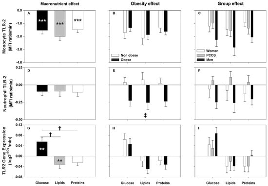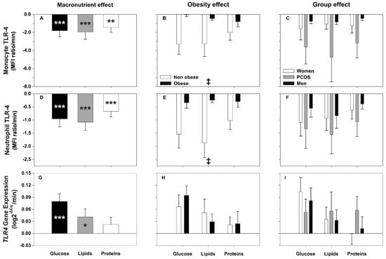 Surface expression of TLR4 decreased significantly in monocytes and neutrophils after ingestion of all the macronutrients (Figure 2A,D and Table S2) regardless of the group of subjects (Figure 2C,F). This effect was actually related to the very large decrease observed in non-obese subjects, because the decrease observed in obese participants was much smaller (Figure 2B,E and Table S2). On the contrary, TLR4 gene expression increased after glucose, lipid, and protein ingestion, even though the later increase did not reach statistical significance, yet no differences in the AUCs of these responses were observed (Figure 2G). Obesity and group of subjects did not influence these responses (Figure 2H,I).