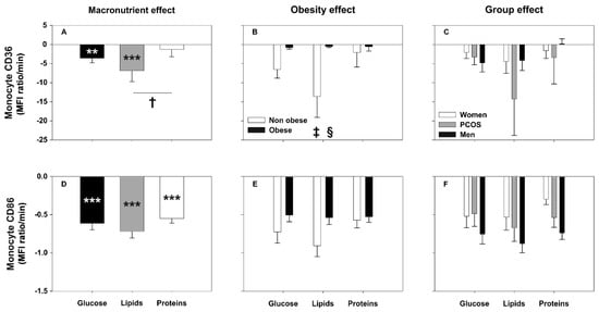 Surface expression of CD86 in monocytes markedly decreased during the postprandial period regardless of the macronutrient ingested (Figure 3D and Table S3). The decrease showed a tendency (p = 0.087) to be greater after lipid than after protein ingestion (Figure 3D), a tendency (p = 0.094) to be larger in non-obese subjects than in obese individuals (Figure 3E) and a tendency (p = 0.073) to be greater in men compared with control women (Figure 3F).