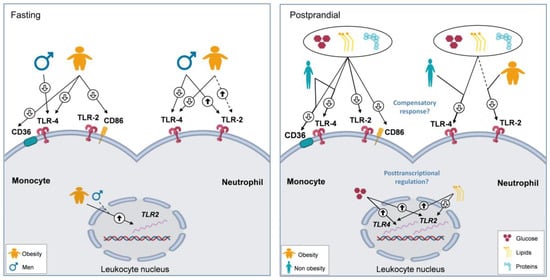 Cell-surface and gene expression of leukocyte activation markers in the fasting and postprandial states. We observed an opposite influence of obesity and sex on surface expression of TLR2 and TLR4 after fasting, and a general decrease in the surface expression after ingestion of all macronutrients which was inversely associated with their respective fasting levels. These results suggest a transient compensatory response to macronutrient intake—which is modulated by obesity—aiming to prevent an exaggerated inflammatory process. However, glucose and lipids, but not proteins, differently and effectively activated leukocyte TLR2 and TLR4 gene expression regardless of obesity and sex, suggesting that the intake of proteins contributes minimally to postprandial inflammation, and that obesity and sex hormones may exert their postprandial influences at the post-transcriptional level.