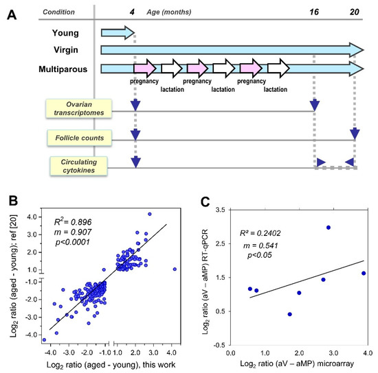 Study flowchart and platform validations: (A) Female C57BL/6 mice were housed from 3 to 20 months in virgin (nulliparous) and multiparous conditions (n = 70 per group). A group of young adult, four-month-old virgin mice (n = 20) was used as a reference. Transcriptomic profiling was done in young (n = 6), 17-month-old virgin (n = 5) and 17-month-old multiparous mice (n = 6). The follicle count was performed in young (n = 3), 20-month-old virgin (n = 16) and 20-month-old multiparous mice (n = 18). Serum cytokines were measured at the diestrous stage in adult young, four-month-old mice (n = 6) and in randomly chosen, 16–20 month-old female mice of both virgin and multiparous groups (n = 4 per group/month). The time scale shown is not proportional. (B) Scatter plot for a 225 genes subset comparing our expression profiling data in young (n = 6) versus aged ovaries, irrespective of parity (n = 11), with that obtained with the NIA-22k platform (n = 2 per group) [20]. Data points between −1.0 and 1.0 log2 range were omitted. (C) Scatter plot depicting RT-qPCR and microarray results for Foxo1, Fst, Fshr, Alas2, Snca, Hba-a1, and Hbb-bt transcripts in the log2 scale for both platforms, so as to compare the transcription of aged-virgin versus aged multiparous ovaries; n = 3 per group in RT-pPCR assays, n = 5 aged virgin, and n = 6 aged multiparous in microarray data. The squared correlation, slope, and p-values are shown within the plot.