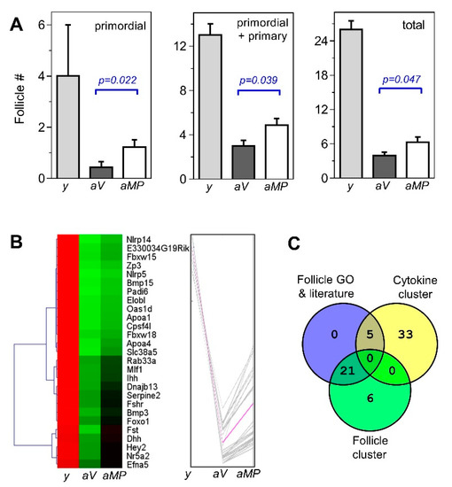 Ovarian follicle counts and cognate ovarian gene expression. (A) Mean (± standard error of the mean (SEM)) primordial, primordial plus primary, and total follicle counts in young (y), aged virgin (aV), and aged multiparous (aMP) ovaries; p-values are indicated. (B) Heatmap of the follicular-like signature (27 differentially expressed genes (DEGs); rows) in ovaries of the three experimental groups (y, aV, and aMP) showing mean absolute levels of quantile normalized log2 scale values. Quality threshold clustering (QTC) clustering was done with MeV (http://mev.tm4.org/) using the Euclidean distance and 0.42 diameter with prior gene/row adjustment divided by root mean square (RMS). The 27-genes cluster was part of the 65 DEGs of a higher expression in the multiparous ovaries (see text). (C) Venn diagram of the 26 follicle associated genes “Follicle GO and literature” according to gene ontology (GO) (Table 2) and literature analysis (Table 3), the 27 genes showing the follicular-like signature, “Follicle cluster”, and the 38 genes of the “Cytokine cluster” (see Section 3.6).