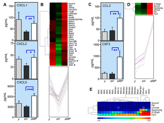 Parity-dependent circulating cytokines levels and related gene expression in aged ovaries: (A,C) Mean (±SEM) serum levels of the indicated cytokines in female young (y), aged virgin (aV), and aged multiparous (aMP) mice are shown with their respective 32-genes (B), and the six-genes (D) expression heatmaps and centroid clusters at the bottom obtained with same settings as that of Figure 2. Significant differences among the cytokine levels were determined after two-tailed Mann–Whitney tests, (*) p < 0.05, (**) p < 0.01, and (***) p < 0.001. Blue dots in the heatmap of (B) indicate genes with a cytokine-like pattern, but evidence of follicle function. Note that the sum of 27-genes (Figure 2B) and the 32 and 6 (38) genes in (B,D) complete the 65 DEGs of a higher expression in multiparous ovaries (see Section 3.3). The heatmap in (E) show the expression levels of the six-gene clusters in peritoneal and intact LPS-treated J774.1 macrophages (M label) and neutrophils (N label). Multiple samples correspond to different LPS doses and incubation times, as described in the Ref-DIC database (http://refdic.rcai.riken.jp/profile.cgi).