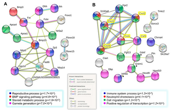 Protein–protein interaction network of genes associated with follicles and innate immunity in aged multiparous ovaries: The follicular-like (A) and the cytokine-like (B) gene clusters were analyzed with STRING v11 for known and predicted relationships existing as protein–protein interaction networks. The corresponding official Mus musculus gene symbols for the cytokines measured in serum were added to both the follicular (27) and the cytokine (32 and 6) clusters separately, to run each analysis. Serum cytokines are highlighted in yellow boxes in (B). The confidence score was set to 0.350, and the unconnected nodes were excluded from the network. Boxes at the bottom of each network indicate color codes for GO terms enriched in the respective protein networks (adj p < 0.05). (*) indicate genes that belong to the cytokine cluster, but show primary evidence of follicle function (see Table 2 and Table 3). Legend to color-coded interaction lines were adapted from the STRINGv11 output.