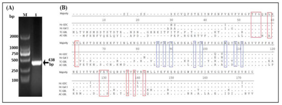 Cloning and multiple sequence alignment of amino acids rHc-Galectin Domain Containing. (A) the PCR generated fragment of GDC gene with molecular size of 438 bp, was obtained from H. contortus cDNA. Lane M: DNA molecular marker; Lane 1: Amplified PCR product. (B) The identity of rHc-GDC protein sequence aligned with Galectin 3 of H. contortus (GenBank: AAD45606.1; Hc-Gal 3), Galactoside-binding lectin of Teladorsagia circumcincta (GenBank: PIO73875.1; TC-GBL) and Galactoside-binding lectin of Ancylostoma caninum (GenBank: RCN38869.1; AC-GBL) was analyzed by ClustalW Multiple sequence software. Putative alternate dimerization interfaces based on amino acids sequences were marked as red boxes and sugar binding pockets based on amino acids sequences were marked as blue boxes. The residue that matches the majority is indicated by “-”.