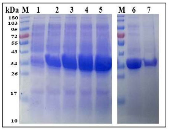 The fragment size of Hc-GDC gene (438) was detected between 500 and 250 (Figure 1A) and confirmed by sequence analysis. Multiple sequence alignment showed that all sequences were closely related with conserved domain residues (Figure 1B). Recombinant plasmid (pET32a + Hc-GDC) was induced with IPTG and analyzed by SDS-PAGE that showed the highest concentration after five hours of induction (Figure 2, Lane 5). The expressed protein showed a molecular weight of about 35 kDa (Hc-GDC, 14.6 ligated with pET32a, 20) after purification (Figure 2, Lane 7).