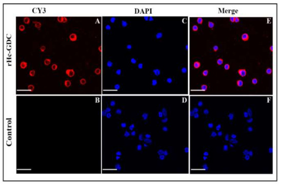 rHc-GDC protein binding to goat Peripheral Blood Mononuclear Cells (PBMCs) by immunofluorescence assay. Localization was performed by incubating PBMCs with rat anti-rHC-GDC IgG and negative rat IgG (control). (A,B) the target proteins (red) were visualized by Cy3-conjugated secondary antibody; (C,D) the nuclei of the corresponding cells were visualized by DAPI (blue) staining; (E,F) merge combination of red and blue channels. No protein binding was observed in the control group. Scale bar 40 μm.