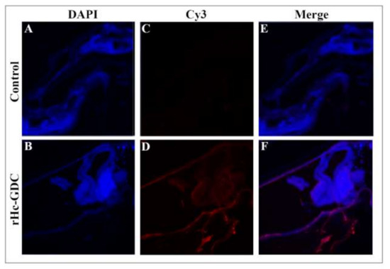 Immunofluorescence assay was performed to detect localization of rHc-GDC using partial body sections of H. contortus adult. Clusters of blue spots inside the body of worms are indicating the position of nuclei along the gut structure in both merge and DAPI sections. IFA results indicated that Hc-GDC (red color) might be localized outer and inner surfaces of the membrane and in the gut region of the parasite as well. No protein was detected in the control group (Figure 5).