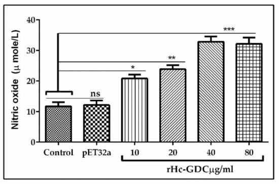 The total nitric oxide assay kit was used to evaluate the effect of rHc-GDC on nitric oxide production by PBMCs. Results revealed that the rHc-GDC with 10 μg/mL, 20 μg/mL, 40 μg/mL, and 80 μg/mL concentration showed significant (ANOVA, F (5, 12) = 25.03, p < 0.001) NO production in PBMCs as compared to control group, whereas no significant difference in NO production was observed between control and pET32a (Figure 8).