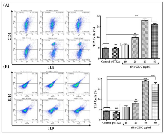 To evaluate the effect of rHc-GDC on Th1, Th2, and Th9 cells, different concentrations of rHc-GDC (10, 20, 40, 80; μg/mL) were incubated with goat PBMCs, and flowcytometry was performed by setting the gate on CD4+ IFN-γ, CD4+ IL4, and CD2+ CD4+ T cell (intracellular antibodies: IL-9 and IL10) were used for the Th1, Th2, and Th9 cell count, respectively. The rHc-GDC didn’t show any effect on the expression of Th1 cells (Data not shown). The rHc-GDC showed a potent capability to induce expression level of IL-4 and Il-9 cytokine; we further examined the impact of rHc-GDC on differentiation of Th9 cells, and found that the proportion of Th2 (Figure 10A) and Th9 cells (Figure 10B) were induced significantly (p < 0.001) by rHc-GDC in a dose-dependent manner. The flowcytometry results revealed that 40 μg/mL of rHc-GDC showed the highest percentage of Th9 (31.35%) production, while percentage production of 20 and 80 μg/mL was recorded as 13.02% and 27.86%, respectively. The data showed that 20, 40, and 80 μg/mL markedly increased as compared to the control group (0 μg/mL) while the group treated with 10 μg/mL rHc-GDC (10.05%) and pET32a group (6.89%) showed no significant difference when compared with the control (4.71%) group (Figure 10).