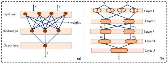 Schematics of artificial neural network (ANN) (a) and adaptive network based fuzzy inference system (ANFIS) (b) architecture. “x” and “y” represent the input variable whereas the “z” characterizes the output variable in both the ANN and ANFIS architecture. The oval structures in layer 1 and layer 4 represent the adaptive nodes. The pentagonal structures in layer 2, 3, and 5 are the predefined fixed nodes.