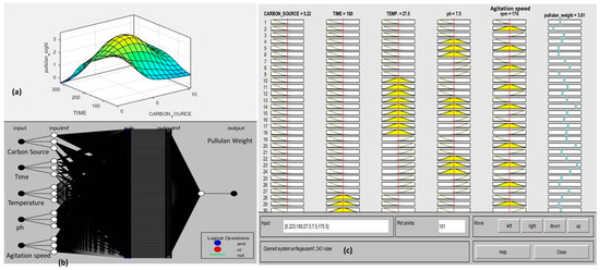 ANFIS combines the best of the two artificial learning tools, i.e., neural networks and fuzzy systems. The tool is considered more potent with enhanced smoothness as well as interpolation flexibility. For input data (50 × 6 matrix, representing static data: 50 samples of five input elements, namely carbon source (g/L), time (h), temperature (°C), pH, agitation speed (rpm) and one output element that is pullulan weight (gm/100 mL)) training a constant type membership function (MF) for each input variable and other default parameters like hybrid train FIS optimization method, 0 error tolerance, 243 rules, and 3 as the number of iterations were chosen. It was not possible to attain an absolute data fitting with concurrent data training; hence, for every training trial a non-zero value of training error occurred (as shown in Figure 3a). The deviation of output was defined by the variation in any of the two selected inputs; the correlation was specified by an ANFIS response surface plot. Here the topmost point on the response surface plot elucidated the maximization of the target value (pullulan yield) (Figure 3a). Only after acquisition of tractable results, performance of FIS was tested against training. The model structure represented the interlinking among different inputs: input MFs, rules, output MFs, and outputs (Figure 3b). The rule viewer of the fuzzy inference system was utilized to understand the entire outgrowth of the process from commencement until the process was concluded (shown in Figure 3c).