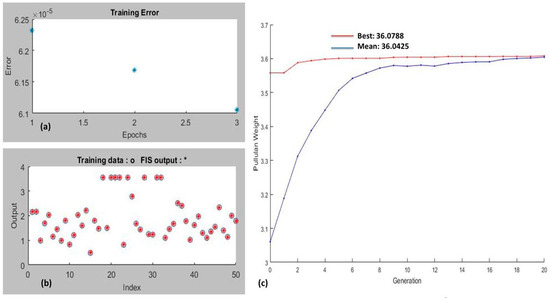 As per the predefined GA problem, all the default parameters were kept similar to the former. While training the ANFIS model, to enhance the prediction accuracy and subsequently decrease the prediction error, numerous plotting of the input dataset took place. The minimum obligatory number of repetitions to perform the mapping function was termed the epoch. As seen in Figure 4a, it was inferred that three epochs were essential to achieve the training process. For the learning capability of FIS, a function was defined by the overlapping position of a red star over the white circles; here, the prominence of overlapping positions also signified better fitting of data training trials (Figure 4b). Five different MFs, namely Gaussian curve membership function (gaussmf), triangular-shaped membership function (trimf), generalized bell-shaped membership function (gbellmf), Gaussian combination membership function (gauss2mf), and difference between two sigmoidal membership functions (dsigmf) were trained to optimize process parameters and targets pullulan yield. Various ANFIS training MFs were chosen, and the resultant optimized GA process parameters and yields are enlisted in Table 3. From the optimized results obtained through the GA–ANFIS approach, it can be concluded that among the various chosen MFs, the Gaussian membership function (gaussmf) was most appropriate for data training as it maximized the value of pullulan weight up to 36.0788 g/L with mean pullulan weight of 36.042 g/L (Table 3; Figure 4c). The other process parameters optimized by the gaussmf MF hybrid GA–ANFIS tool were substrate consumption 49.94 (g/L) at temperature 27.41 °C, with agitation speed 190.08 rpm at pH 6.99 and incubation period 182.39 h (Table 3).