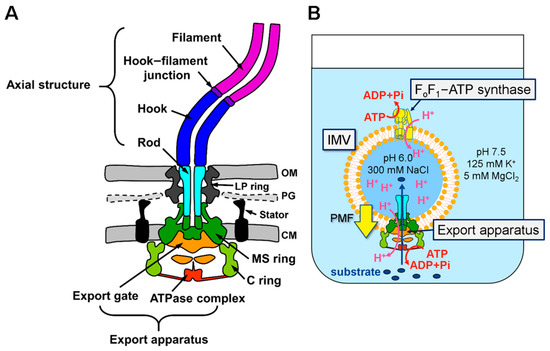 The bacterial flagellum is a tubular organelle extending out from the cell surface, and is rotated by a nano-scale rotary motor embedded in the cytoplasmic membrane. Flagellar construction starts with the assembly of the basal structure containing the MS-ring, the C-ring, and the flagellar protein export apparatus in the cytoplasmic membrane, followed by assembly of the filamentous axial structure composed of the rod, the hook, the hook–filament junction, the filament, and the filament cap on the basal structure (Figure 1A) [1,2,3]. A certain copy number of component proteins assemble into each substructure in a specific order [1]. The axial proteins are transported via the flagellar export apparatus, which belongs to the type III secretion system family, into the central channel of the growing tubular axial structure and diffuse through it to the distal end, where they are incorporated into the structure [4,5]. The export apparatus consists of a transmembrane export gate composed of FlhA, FlhB, FliP, FliQ, and FliR, and a cytoplasmic ATPase complex composed of FliH, FliI, and FliJ [1,2,3]. The MS-ring and the C-ring function as a housing for the export gate and a sorting platform for the cytoplasmic ATPase complex, respectively [6,7].