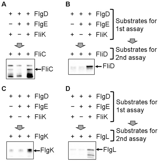 We first incubated IMVs with the substrate proteins required for hook formation (FlgD, FlgE, and FliK), the cytoplasmic ATPase complex proteins (the FliH2/FliI complex and FliJ), ATP, and Mg2+ for 1 h at 37 °C to form the hook in the IMVs, as previously described [29]. The IMVs were precipitated by ultra-centrifugation and then used for in vitro transport assays for the filament-type proteins. The IMVs with the hook–basal bodies were suspended into transport assay mixtures containing the FlgN/FlgK, FlgN/FlgL, FliS/FliC, and FliT/FliD chaperone–substrate complexes and the components of the cytoplasmic ATPase complex. The mixtures were then incubated for 2 h at 37 °C after adding ATP and Mg2+. FlgK, FlgL, FliC, and FliD were transported into the IMVs, but were not transported in the absence of either FliK or FlgE (Figure 2). These results indicate that both FliK and the presence of the completed hook structure are required for the export of the filament-type proteins into the IMVs. Therefore, we suggest that purified FliK alone triggers switching of the substrate specificity of the flagellar protein export apparatus upon completion of hook assembly.