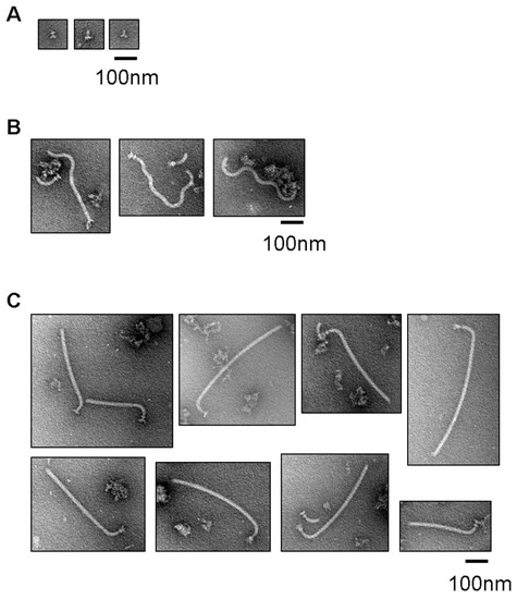 Sample solutions were applied to carbon-coated copper grids and negatively stained with 2.0% (w/v) phosphotungstic acid or 2.0% (w/v) uranyl acetate. Images were observed with a JEM-1010 transmission electron microscope (JEOL, Tokyo, Japan) operating at 100 kV using a BIOSCAN model 792 CCD camera, a JEM-1011 transmission electron microscope (JEOL, Tokyo, Japan) operating at 100 kV using a TVIPS TemCam-F114 CCD camera or a TemCam-F415 CCD camera, or a JEM-2010 transmission electron microscope (JEOL, Tokyo, Japan) operating at 200 kV using a Orius SC200D model 833 CCD camera (Gatan, Pleasanton, CA, USA).
